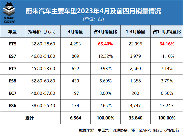 同時(shí),「探客出行」從懂車帝獲悉,蔚來當(dāng)前的在售車型有六款(含4月開始交付的EC7車型)。其中,ET5在4月實(shí)現(xiàn)了4293臺的銷量,占六款車型總銷量的65.40%。其次ES7的4月銷量僅有809臺,銷量占比約12.32%,余下4款銷量占比均不到10.00%。