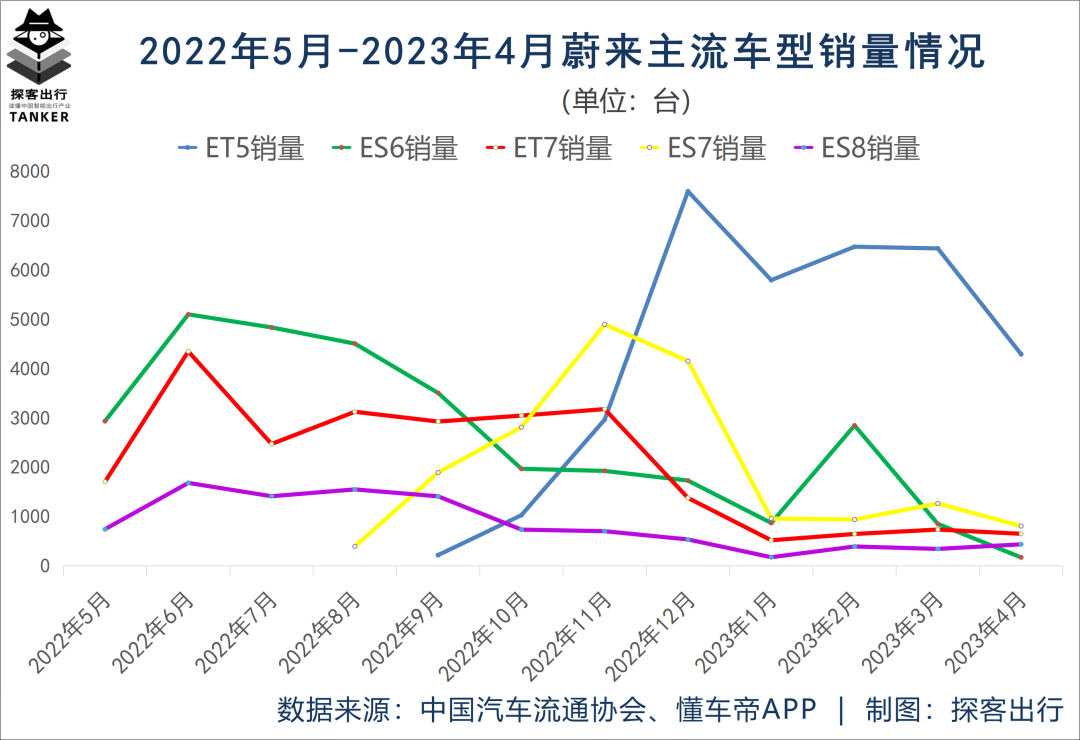 「探客出行」從懂車帝數(shù)據(jù)獲悉,蔚來的五款(除4月開始交付的EC7)在售車型中,于2022年8月開啟交付的ES7,從首月398臺開始一路狂飆到11月達(dá)4897臺,隨后在今年1月迅速回落至961臺,此后連續(xù)4個(gè)月止步于1000臺上下。