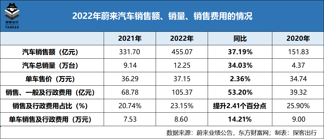 通常來說,隨著產(chǎn)銷量的提升,銷售、一般及行政費(fèi)用會逐步被攤薄,而蔚來2022年年報(bào)給出的數(shù)據(jù)卻不降反增。
