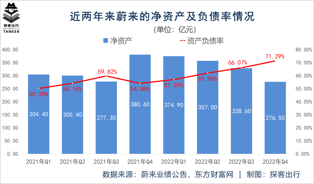 財(cái)報(bào)數(shù)據(jù)顯示,截至2022年末,蔚來資產(chǎn)總額約962.60億元,同比增長16.14%;負(fù)債總額約686.20億元,同比大增53.10%。凈資產(chǎn)約276.50億元,同比下降27.35%。由于負(fù)債增速遠(yuǎn)大于資產(chǎn)增速,凈資產(chǎn)出現(xiàn)明顯縮水的同時(shí)資產(chǎn)負(fù)債率高達(dá)71.29%,比上年末增加了17.21個(gè)百分點(diǎn)。