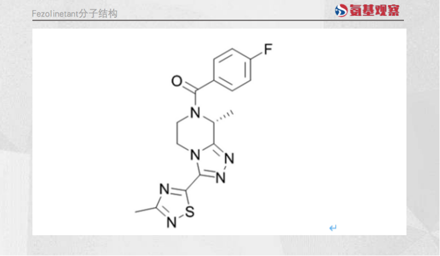 Fezolinetant是一款口服、選擇性神經(jīng)激肽3(NK3)受體拮抗劑,通過(guò)阻斷神經(jīng)激肽3(NK3)與Kisspeptin/神經(jīng)激肽/強(qiáng)啡肽(KNDy)神經(jīng)元的結(jié)合,調(diào)節(jié)大腦體溫調(diào)節(jié)中樞(下丘腦)的神經(jīng)元活動(dòng),以降低絕經(jīng)相關(guān)中重度VMS的頻率和嚴(yán)重程度。