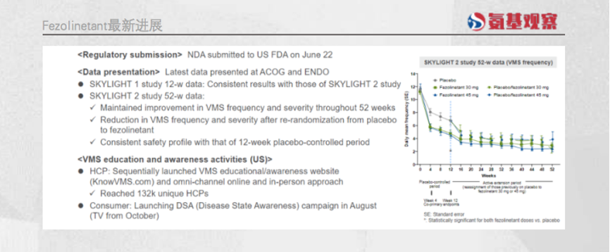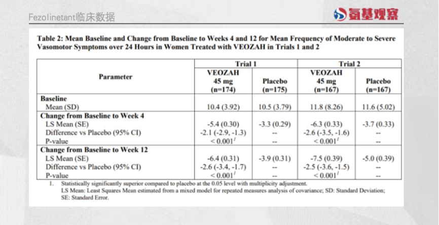 在SKYLIGHT 1和SKYLIGHT 2試驗(yàn)中,為1022名40至65歲患有中度至重度血管舒縮癥狀的女性每日口服一次Veozah? (30mg和45mg)的療效和安全性,同時(shí)進(jìn)行安慰劑組對(duì)照。通過(guò)兩項(xiàng)試驗(yàn)的結(jié)果可以發(fā)現(xiàn),與安慰劑相比,服用45mg Veozah?的中度至重度血管舒縮癥狀的頻率和嚴(yán)重程度,從基線到第4周和第12周在統(tǒng)計(jì)學(xué)上均實(shí)現(xiàn)了顯著性的降低,兩項(xiàng)臨床中分別減少2.6次和2.5次。與傳統(tǒng)HRT相比,fezolinetant作用起效更加迅速,并能持續(xù)數(shù)周。