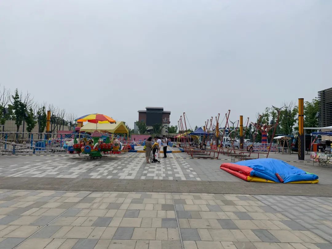 從空蕩蕩的地下停車場來到園區(qū)門口,小鎮(zhèn)正門對(duì)面擺放了很多兒童娛樂設(shè)施,但周末的時(shí)間,只有一個(gè)孩子在家長的陪同下坐小火車。
