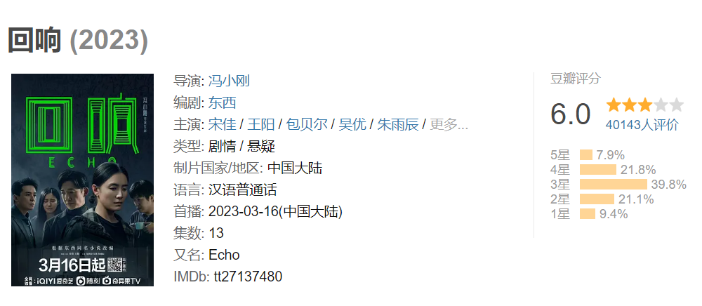 今年3月,不服輸?shù)鸟T小剛用一部情感懸疑雙主線的《回響》再度沖擊電視劇市場,雖說電影畫面的質(zhì)感俘獲了不少觀眾,但是劇集里體現(xiàn)出的劇情邏輯及價(jià)值觀硬傷,還是讓這部劇集只獲得了豆瓣6.0分的低分。