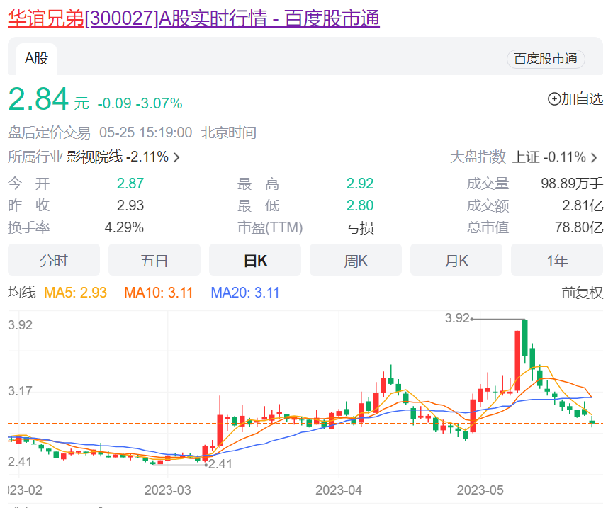 而連年的業(yè)績低迷,也讓華誼兄弟的股價(jià)跌跌不休,從上市初期的超過70元的高點(diǎn),跌至現(xiàn)在的不足3元,市值也從最高點(diǎn)的724.16億元跌至現(xiàn)在的不足百億。