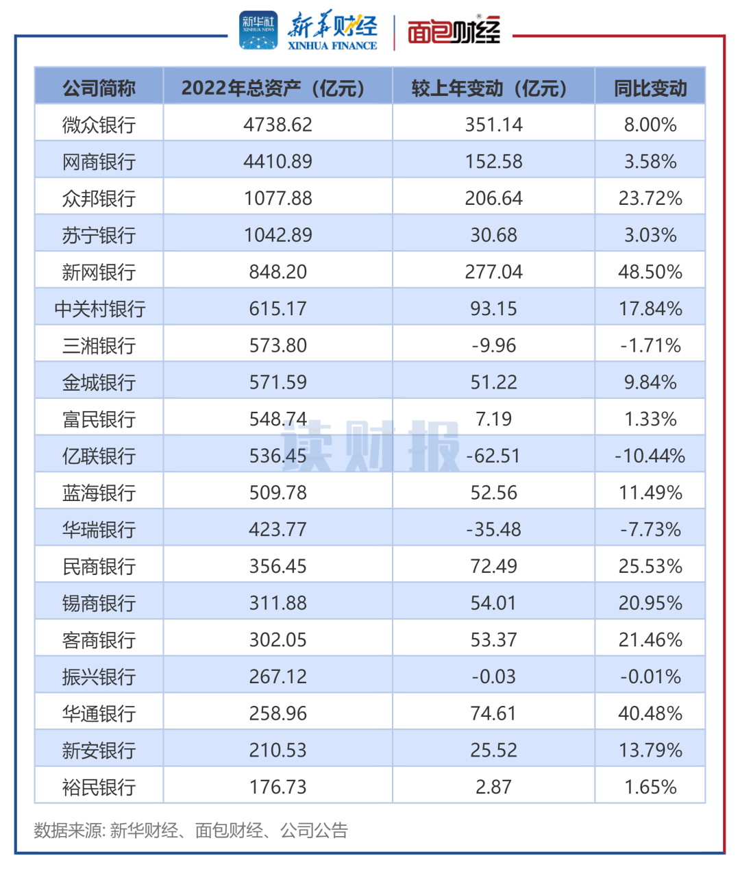 總資產(chǎn):微眾、網(wǎng)商、眾邦、蘇寧銀行超千億,億聯(lián)銀行下降超10%