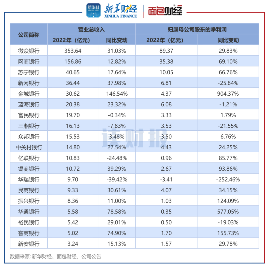 營收凈利潤:微眾、網(wǎng)商銀行居前二,華瑞銀行降幅最大