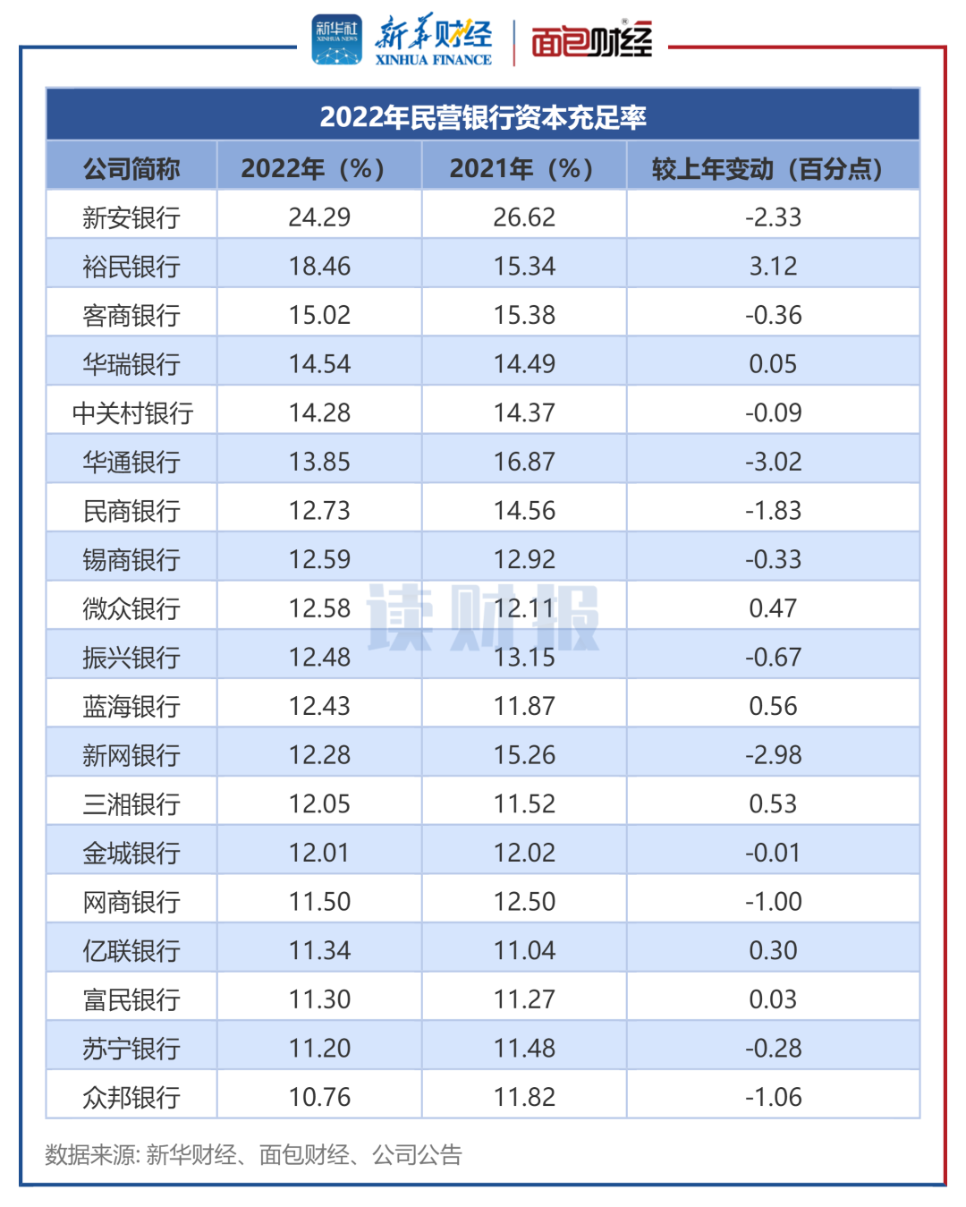 較2021年末相比,截至2022年末,裕民銀行的資本充足率增加3.12個百分點,增長最快。另外還有6家銀行的資本充足率較上年末出現(xiàn)提升,增幅在0.03個百分點至0.56個百分點之間。華通銀行的資本充足率下降較快,較2021年末下降3.02個百分點;此外,新網(wǎng)銀行、新安銀行的降幅均超2個百分點。