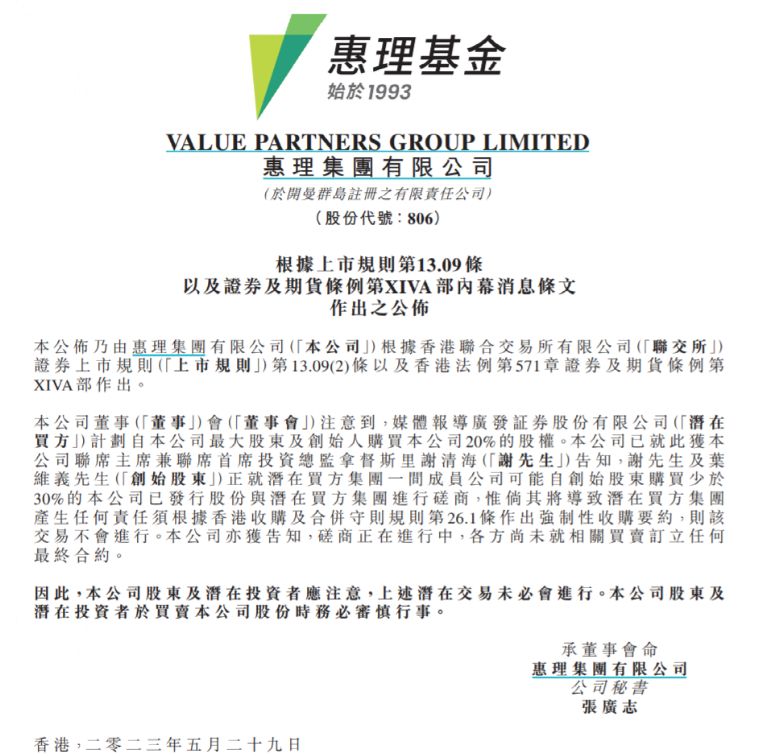惠理集團(tuán)表示,其獲聯(lián)席主席兼聯(lián)席首席投資總監(jiān)謝清海告知,關(guān)于潛在買(mǎi)方集團(tuán)可能向公司創(chuàng)始股東購(gòu)買(mǎi)少于30%的公司已發(fā)行股份一事,創(chuàng)始股東謝清海及葉維義正與潛在買(mǎi)方集團(tuán)進(jìn)行磋商。