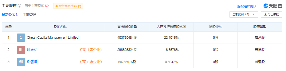 根據(jù)天眼查,惠理集團(tuán)有限公司目前主要股東為Cheah Capital Management Limited(持股數(shù)量占已發(fā)行普通股比例22.1015%)、葉維義(持股數(shù)量占已發(fā)行普通股比例16.3576%)、謝清海(持股數(shù)量占已發(fā)行普通股比例3.3247%)。