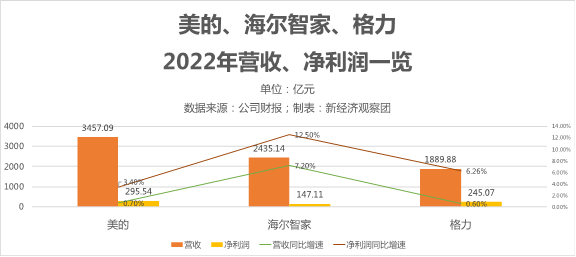 不過,盡管2022年海爾智家的凈利潤增速最快,高達12.5%,營收領(lǐng)先格力600億元,但其整體利潤水平依舊墊底,僅為147.11億元,與美的和格力的差距都達到了百億元。