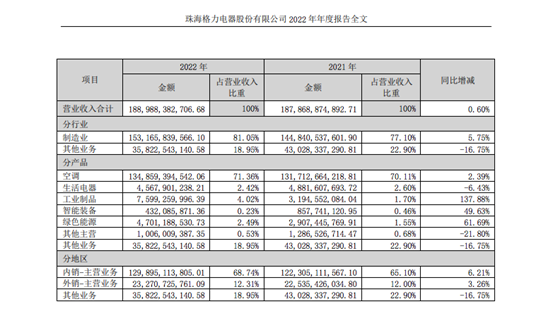 但從2022年財報來看,格力的多元化發(fā)展成效并不顯著:其生活電器營收實現(xiàn)45.67億元,同比下滑6.43%,占比營收2.6%。其后的工業(yè)制品、綠色能源、智能裝備等營收占比更微不足道,僅為1.7%、1.55%、0.46%。