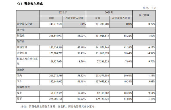 不過,美的也非高枕無憂。2022年,美的的暖通空調(diào)業(yè)務(wù)同比增長6.17%,占據(jù)同樣地位的消費電器業(yè)務(wù),營收同比下滑4.99%,這也是造成美的2022年營收增速處于0.7%的低位。