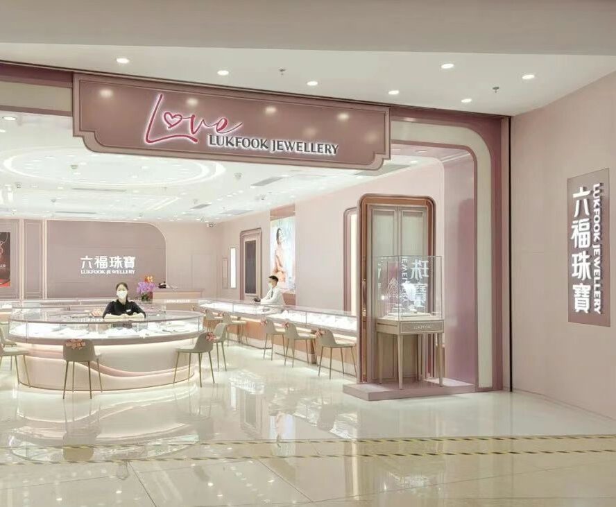 這間品牌店位于湛江市新興城市綜合體項(xiàng)目鼎盛廣場(chǎng)內(nèi)。Love LUKFOOK JEWELLERY品牌店以粉色為主視覺基調(diào),營造溫馨浪漫的氛圍。