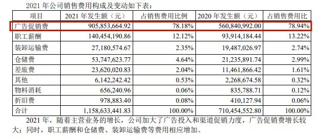 以2021年為例,全年?duì)I銷費(fèi)用11.59億元,廣告費(fèi)就占去了9億