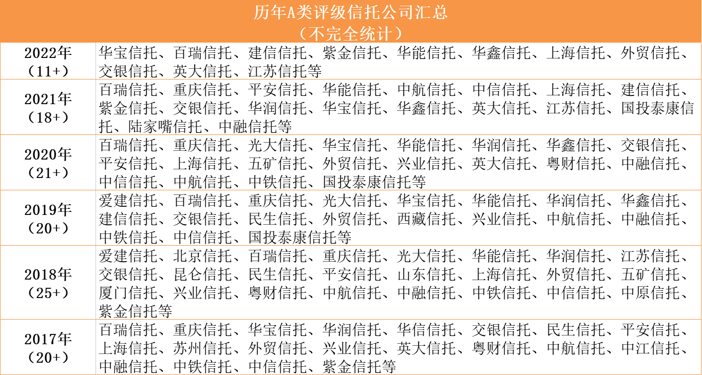 從歷年評級情況看,雖然每年名單成員都有增有減,但自2017年以來,包括百瑞信托、華潤信托、上海信托、交銀國際信托等機構(gòu)連續(xù)六年保持A評級。