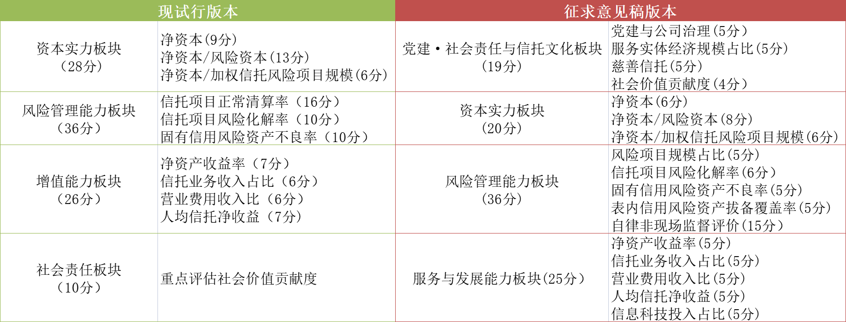 其中,四大板塊更新為黨建·社會責任與信托文化、資本實力、風險管理能力、服務與發(fā)展能力;原有11個指標中刪除了信托項目正常清算率指標,同時增加了黨建與公司治理、服務實體經(jīng)濟規(guī)模占比、慈善信托、風險項目規(guī)模占比、信用風險資產(chǎn)撥備覆蓋率、自律檢查中非現(xiàn)場檢查占比、信息科技投入占比七個項目。