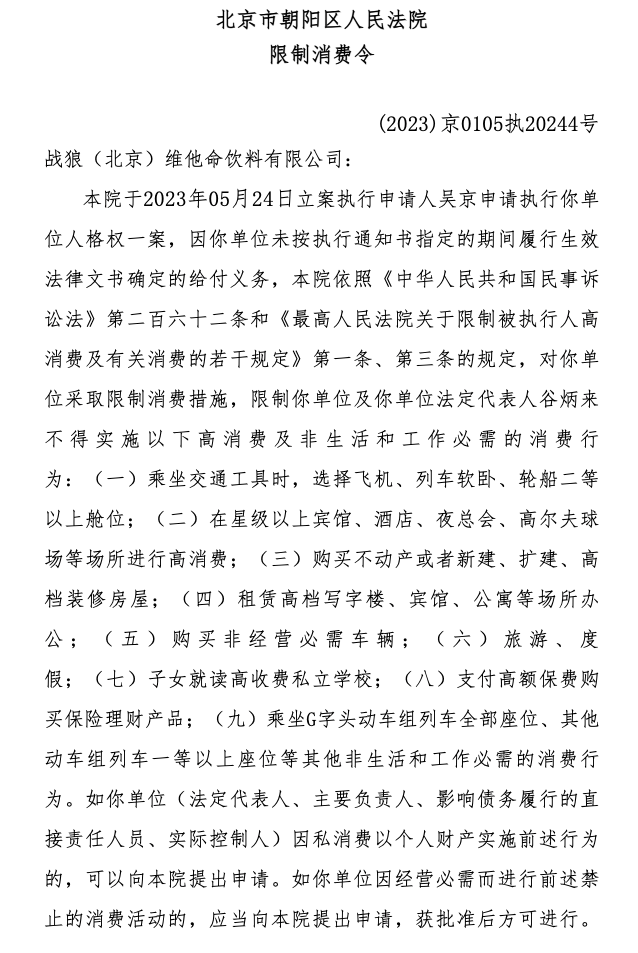 中國(guó)執(zhí)行信息公開(kāi)網(wǎng)顯示,6月6日,戰(zhàn)狼維生素飲料關(guān)聯(lián)公司戰(zhàn)狼(北京)維他命飲料有限公司新增一則限制消費(fèi)令,申請(qǐng)人為吳京,涉及吳京與該公司人格權(quán)糾紛案件。