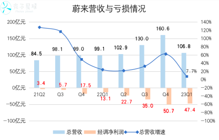 數據顯示,一季度公司營收為106億元,同比增長7.7%。平臺切換與新車上市,因此虧損面有所擴大,經調整凈利潤虧損41.5億元,去年同期虧損13.1億元。大約每賣一輛車,就會虧損13.4萬元。