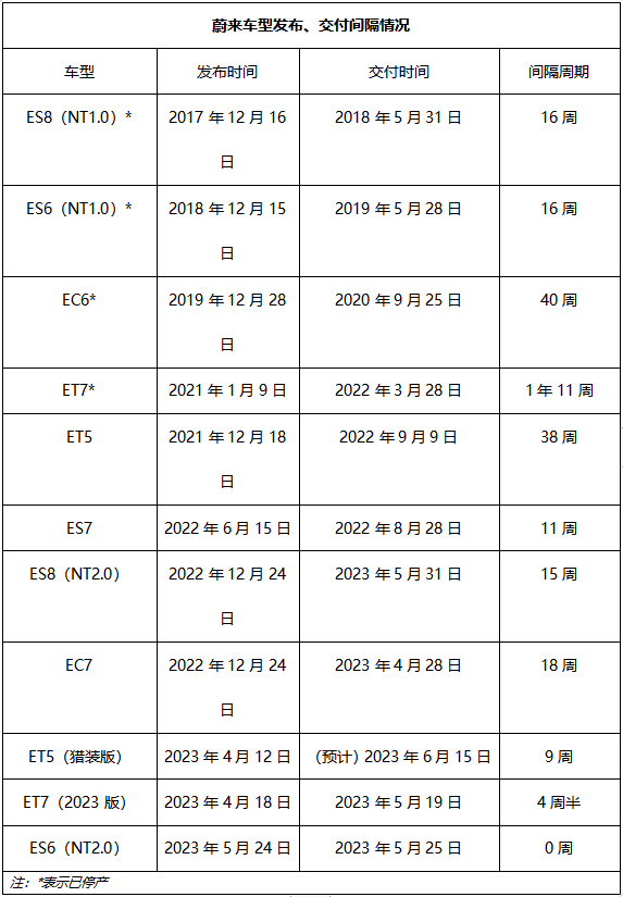 EC7與新款ES8長達十余周的交付周期與一個月內交付的ES6、ET7撞了個滿懷。于是從4月28日開始的短短一個月內,蔚來扎堆交付含改款在內的4款新車。