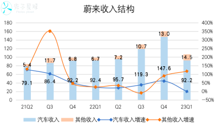 截至一季度,蔚來來自汽車銷售的收入為92.2億元,同比微降0.2%。