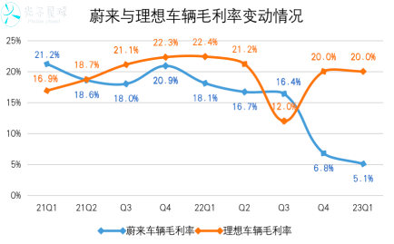 2021年第一季度,蔚來毛利率為21.2%高于理想的16.9%。隨后除了去年第三季度理想因為疫情和供應鏈原因毛利率跌至12%,被蔚來反超外,其余7個季度其單車毛利皆高于蔚來。