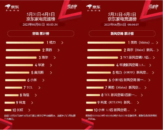 高溫也將空調(diào)銷售推向了白熱化。家電品牌以炎夏為契機(jī),大力加碼營(yíng)銷。早在5月下旬,618家電大促已打響。京東平臺(tái)的家電競(jìng)速榜數(shù)據(jù)顯示,5月31日至6月1日,空調(diào)品類銷售排名前三的是格力、美的和海爾。