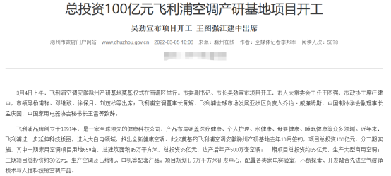 飛利浦空調(diào)百億投資,來源:滁州市政府官網(wǎng)