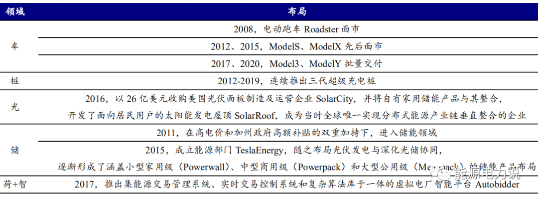 “光+儲(chǔ)”組成特斯拉新能源生態(tài)體系的產(chǎn)能端,在“車+樁”的用能端取得突破的基礎(chǔ)上,特斯拉布局儲(chǔ)能項(xiàng)目開(kāi)發(fā)、光伏和儲(chǔ)能設(shè)備制造、光伏發(fā)電運(yùn)營(yíng)等領(lǐng)域,形成在產(chǎn)能端的光儲(chǔ)協(xié)同布局。