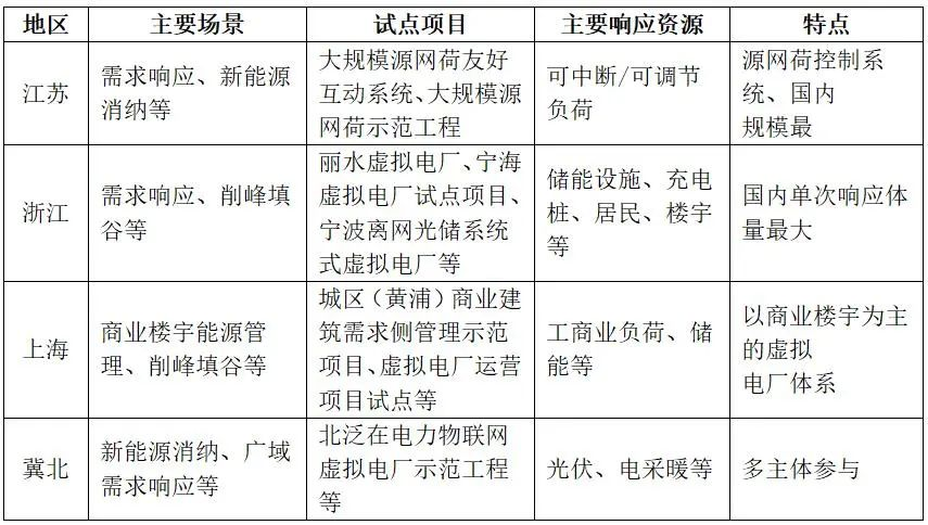 江蘇、冀北、上海、浙江、天津、深圳等地結(jié)合區(qū)域特點(diǎn)開(kāi)展了虛擬電廠的試點(diǎn)應(yīng)用,其中江蘇虛擬電廠可提供快速可中斷的負(fù)荷控制服務(wù);上海虛擬電廠建設(shè)以聚合商場(chǎng)、樓宇等需求響應(yīng)為主,積極推進(jìn)負(fù)荷集成商為主體運(yùn)營(yíng)的商業(yè)運(yùn)營(yíng)模式;冀北虛擬電廠提出了“云管邊端”技術(shù)架構(gòu),并將虛擬電廠納入電力輔助服務(wù)范圍;深圳成立了國(guó)內(nèi)首個(gè)城市級(jí)虛擬電廠管理中心,以負(fù)荷型、儲(chǔ)能型資源聚合為主。