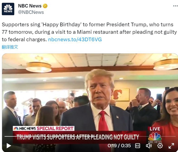 在否認(rèn)37項(xiàng)聯(lián)邦刑事指控后,特朗普離開法院前往當(dāng)?shù)匾患揖W(wǎng)紅餐館。等候在餐館中的粉絲們用生日快樂歌迎接這位兩次遭彈劾、兩次被刑事起訴的前國家元首。