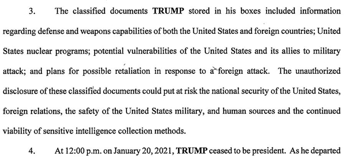 起訴書指出,特朗普保留的機(jī)密文件涉及美國和其他國家的國防和武器情況、美國的核項(xiàng)目、美國及其盟友可能受到軍事攻擊的薄弱點(diǎn)、美國遭到外國攻擊時(shí)可能做出的反擊計(jì)劃。這些機(jī)密信息流出將危害美國的國家安全、外交關(guān)系、軍人安全以及情報(bào)收集工作。