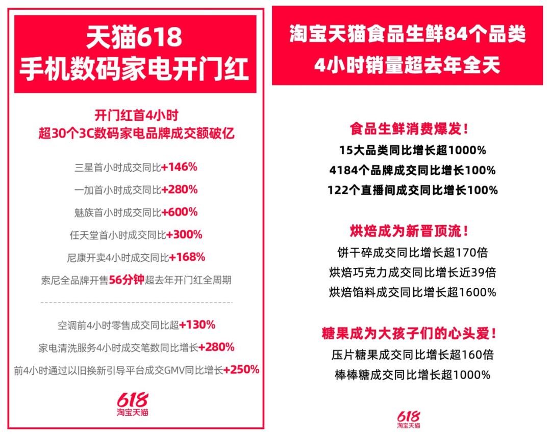 淘寶天貓發(fā)布的相關(guān)數(shù)據(jù)顯示,平臺618活動啟動后4小時內(nèi),美妝、生鮮、家電等多條賽道表現(xiàn)不俗,其中,生鮮15大品類同比增長超1000%,4184個品牌成交額同比增長100%。且在 6月1日當(dāng)天,淘寶直播成交支付金額超51億元,其中,平臺20多個直播間成交額破千萬。