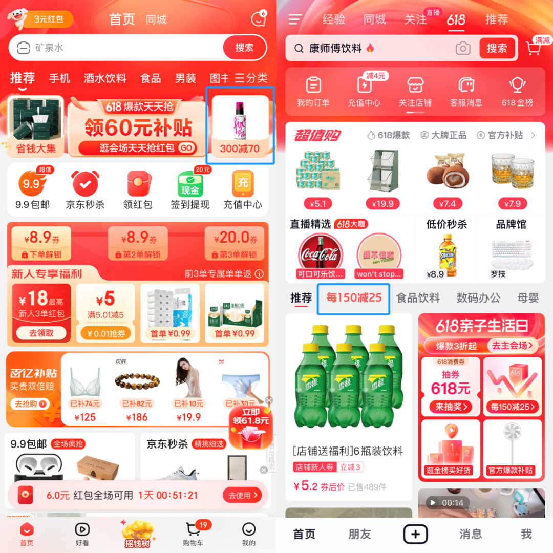 整體的低價策略下,相較以往復(fù)雜的優(yōu)惠模式,今年618各平臺的活動多以直降、折扣、滿減的形式為主,比如淘寶聚劃算“百億補貼”、618喵運會瓜分5億紅包、跨店滿300-50等活動;京東疊加紅包最高可實現(xiàn)滿300-70;抖音更是將滿減門檻拉低至150元(滿150-25)。