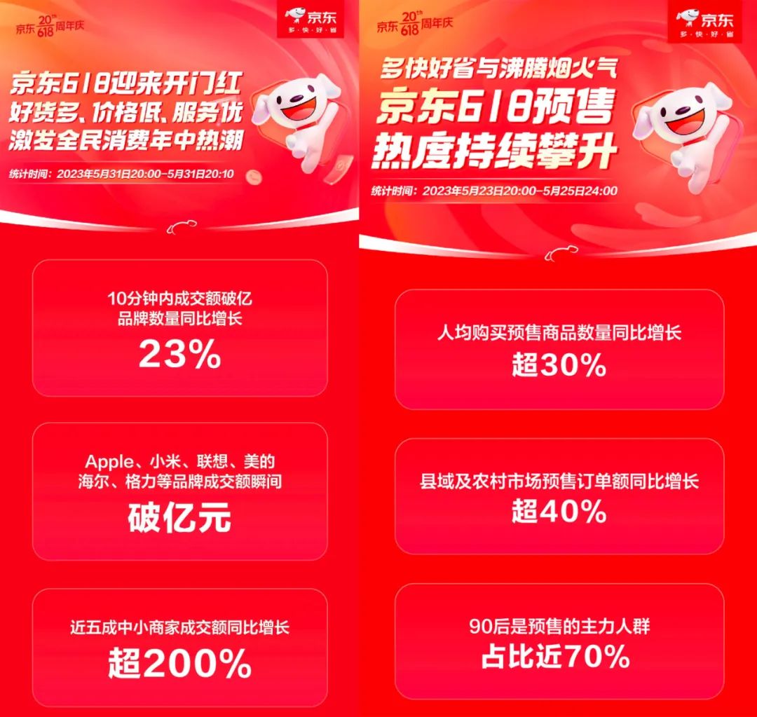 京東也推出類似的扶持方式,且整體扶持周期拉得更長。包括在618首輪戰(zhàn)報中,京東還特別突出,在活動首日,平臺超六成的新商家在10分鐘內(nèi)的成交額突破五月日均全天,近五成中小商家成交額增長超200%。
