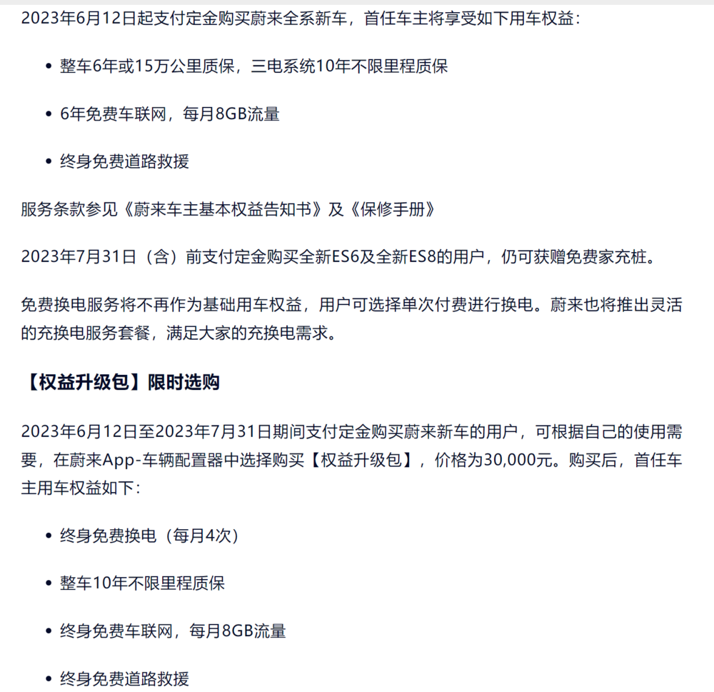 很多地方,換電站不像江浙滬一樣普及,很多人想買蔚來的車,不得不捆綁免費換電權(quán)益,對消費者來說,與其要用不上的權(quán)益,還不如實打?qū)嵉谋阋?。之前?月9日,蔚來就宣布從6月1日起,將四款車型的家用充電樁由免費贈送改為付費購買,并且將每月6次免費換電(不保留家充樁)下調(diào)至每月4次,但并沒有涉及價格。
