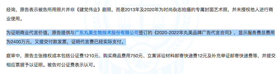 而楊穎方面則拿出了與廣東丸美生物技術(shù)股份有限公司簽訂的《2020-2022年丸美品牌廣告代言合同》來證明自己的商業(yè)代言價(jià)值,代言合同顯示楊穎3年的服務(wù)費(fèi)總費(fèi)用為2400萬元,且證明了代言費(fèi)已經(jīng)實(shí)際支付。
