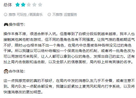 此外,在上線前的“策劃面對面”,也說明對半縮減等級提升的數(shù)值成長,讓新玩家的1級英雄也能應對老玩家的滿級英雄。不過從體驗來看,匹配不平衡仍舊存在一些問題。因為保留老玩家測試數(shù)據(jù)存檔,游戲存在一輪被壓制后,便進入人機比賽,再進入可能被壓制的冰火兩重天體驗中?;蛟S因為一些體驗問題,游戲評分也從8.1分滑落至6.1。相關負面評論主要集中在角色獲取養(yǎng)成較隨機、匹配不平衡和合作體驗欠佳上。