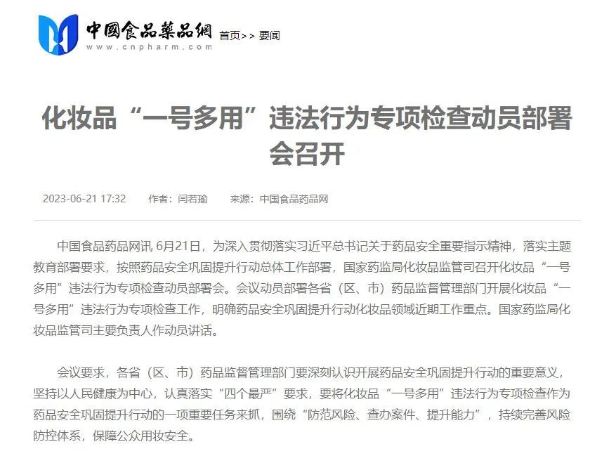 6月21日,中國(guó)食品藥品網(wǎng)發(fā)布消息,國(guó)家藥監(jiān)局化妝品監(jiān)管司召開會(huì)議,將部署開展化妝品“一號(hào)多用”違法行為專項(xiàng)檢查工作。