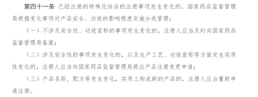 2021年5月實(shí)施的《化妝品注冊(cè)備案管理辦法》第四十一條指出,已經(jīng)注冊(cè)的特殊化妝品,產(chǎn)品名稱、配方等發(fā)生變化,實(shí)質(zhì)上構(gòu)成新的產(chǎn)品的,注冊(cè)人應(yīng)當(dāng)重新申請(qǐng)注冊(cè)。正是在強(qiáng)調(diào)“一品一證”。