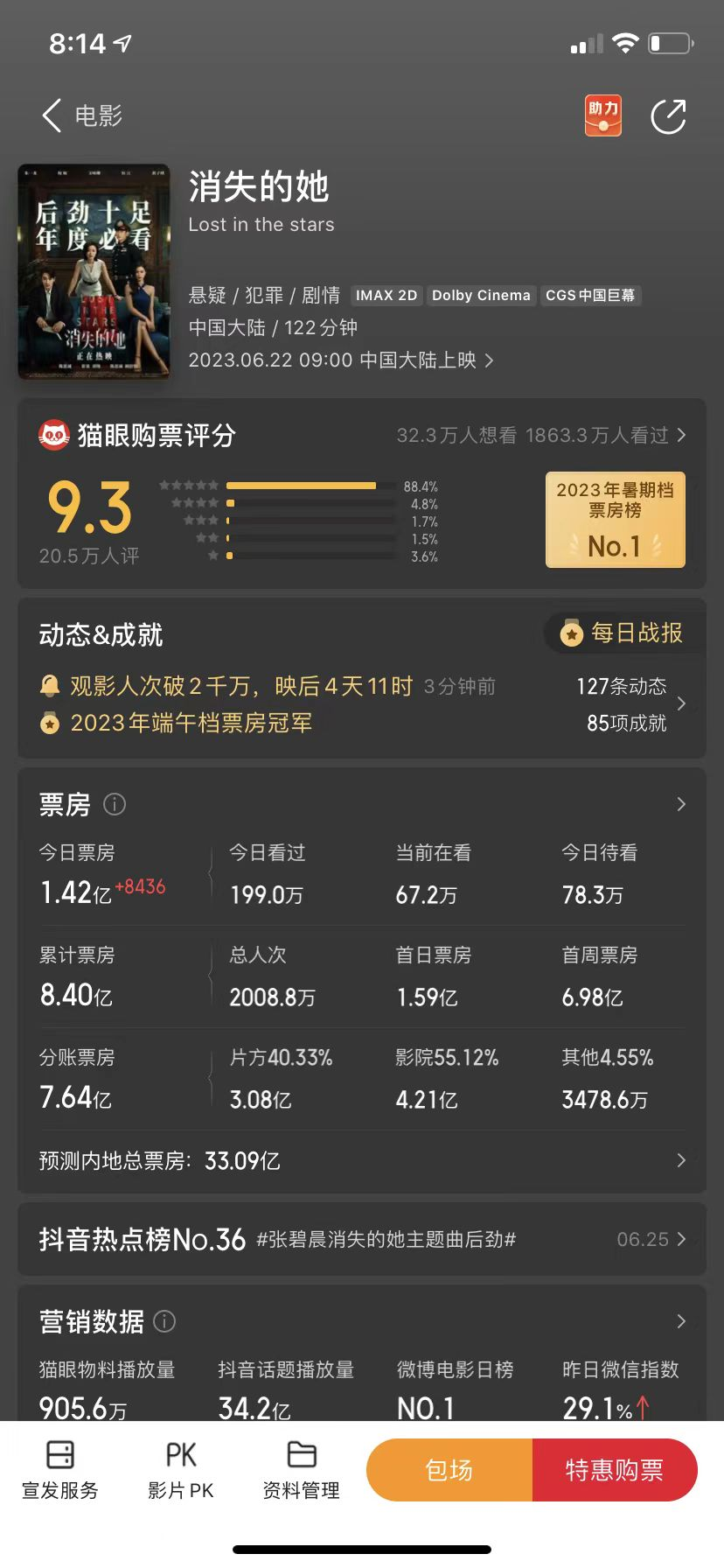 貓眼專業(yè)版對(duì)《消失的她》預(yù)測落點(diǎn)更是連翻了幾番,從一開始的6億+到16億+,昨日更是上調(diào)為33億+。連朱一龍粉絲都表示“被嚇到”。懸疑類型商業(yè)片怎樣才能將“消失的觀眾”拽回影院?“陳思誠制造”對(duì)此明顯造詣?lì)H深。