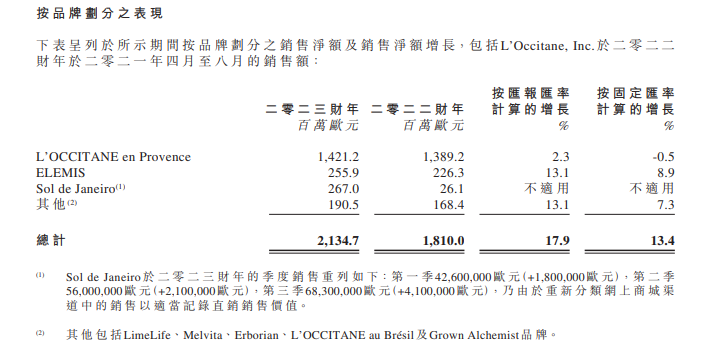 其他品牌也錄得不同程度增長,按固定匯率計(jì)算增長7.3%。Erborian及L’OCCITANE au Brésil表現(xiàn)出色,按固定匯率計(jì)算分別增長33.4%、41.2%。