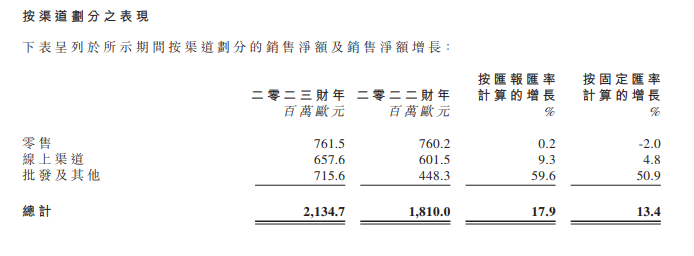 本財(cái)年線上渠道以固定匯率計(jì)算同比增長4.8%,主要由Sol de Janeiro帶動(dòng)。由于客流量回歸實(shí)體渠道以及LimeLife表現(xiàn)欠佳,撇除Sol de Janeiro的貢獻(xiàn),線上渠道跌幅達(dá)高單位數(shù)百分比。這或許也同上文提到英國對(duì)于線上渠道的限制有關(guān)。
