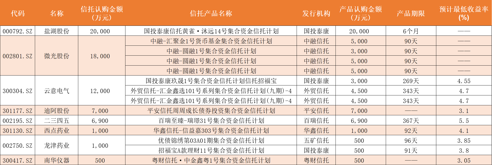 Wind統(tǒng)計(jì),今年以來(lái),鹽湖股份及其子公司合計(jì)已買入信托產(chǎn)品11億元,認(rèn)購(gòu)金額已占2022全年凈利潤(rùn)(22億元)的50%,金額在39家購(gòu)買信托產(chǎn)品的上市公司中居首位。
