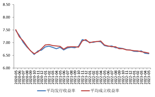 據(jù)此前國(guó)投泰康信托研發(fā)部統(tǒng)計(jì),2023年1至5月,集合信托產(chǎn)品對(duì)應(yīng)的平均發(fā)行收益率6.66%、6.65%、6.67%、6.58%和6.56%;平均成立收益率6.68%、6.67%、6.64%、6.62%和6.59%。