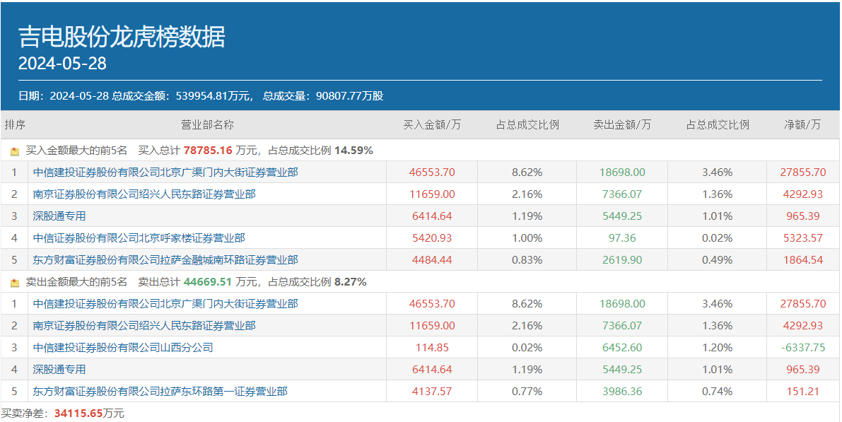 值得一提的是,除了吉電股份以外,呼家樓的常用席位近日還多次出現(xiàn)明星電力(600101.SH)龍虎榜買方前五位中,5月24日南京證券紹興人民東路位列該股買方第二位,買入金額為5474.61萬元,5月27日和5月28日上述席位又分別以6066.23萬元和8068.83萬元居于該股買方榜首。