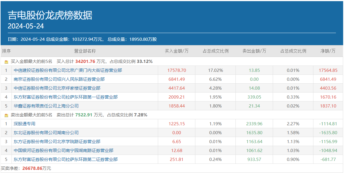 呼家樓為老牌實力游資,敢于主動引導(dǎo)個股,風(fēng)格上大開大合。值得一提的是,5月24日呼家樓的上述三個常用席位就曾包攬吉電股份龍虎榜買方前三位,合計買入金額達(dá)2.88億元。
