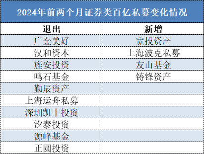 與此同時,也有4家私募在今年前兩個月內(nèi)新進出現(xiàn)在百億私募名單中,分別是寬投資產(chǎn)、友山基金、鑄鋒資產(chǎn)和上海波克私募。