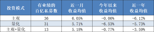 按照不同的投資模式劃分,從今年以來的收益表現(xiàn)來看,主觀策略百億私募表現(xiàn)最優(yōu),收益均值為-0.06%;主觀+量化策略次之,收益均值為-0.77%;量化策略私募則以-6.53%的收益均值排名墊底。從近一個月的收益表現(xiàn)來看,主觀策略百億私募依然拔得頭籌,收益均值為6.05%,量化策略和主觀+量化策略的收益均值則依次分別為5.71%和5.18%。