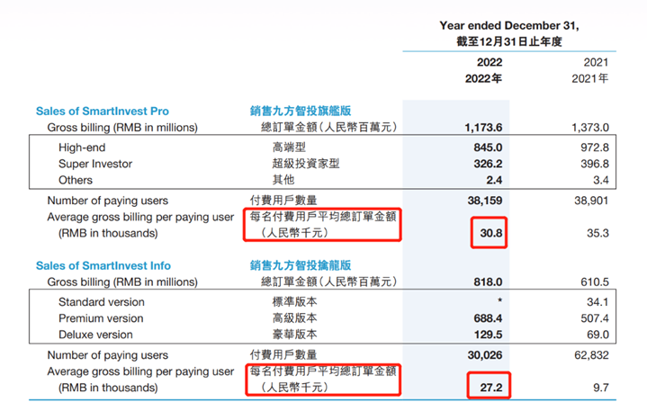 九方財(cái)富2022年年報(bào)披露,九方智投旗艦版(高端投教服務(wù))及九方智投擒龍版(金融信息軟件服務(wù)),按付款金額計(jì)的退款率攀升至22.7%及24.3%,即約4名-5名付費(fèi)用戶中就有1人退款;而2021年這兩項(xiàng)產(chǎn)品及服務(wù)的退款率分別為16.3%及15.8%。